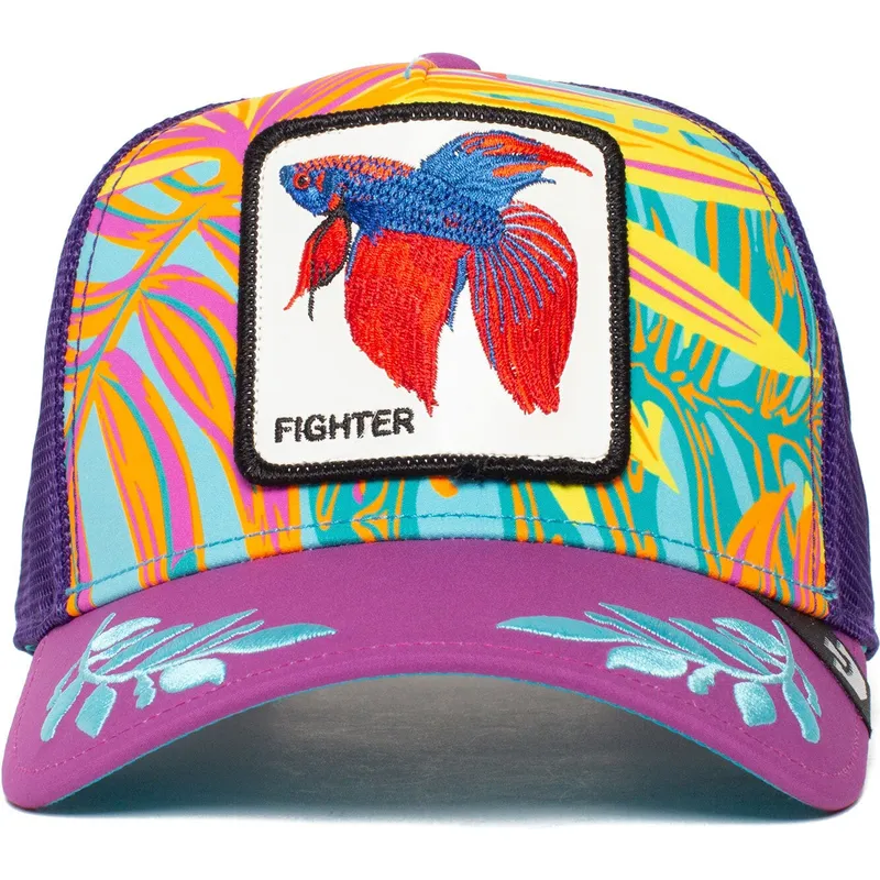 Goorin Bros. Siam Fighter Even Betta The Farm lila truckerkeps är ett sant konstverk i hattform. Detta unika plagg är ännu ett exempel på märkets passion för kvalitetsaccessoarer och innovativa designer. Siam Fighter Even Betta är den obestridda stjärnan på den broderade lappen på hattens framsida, vilket framhäver dess skönhet och vildhet. Goorin Bros. har fångat djurets essens i varje detalj, från linjerna till färgernas intensitet.