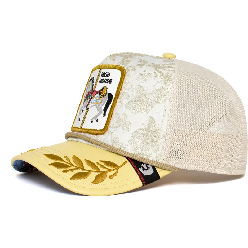 Goorin Bros. High Horse Altus Equo Carousel The Farm vit och beige truckerkeps är det perfekta komplementet till vilken outfit som helst. Med en unisexdesign är denna keps idealisk för vuxna som letar efter stil och komfort. Med snapback-stängningen kan du justera den till den perfekta storleken, medan dess lastbilsform ger den en modern och urban touch.