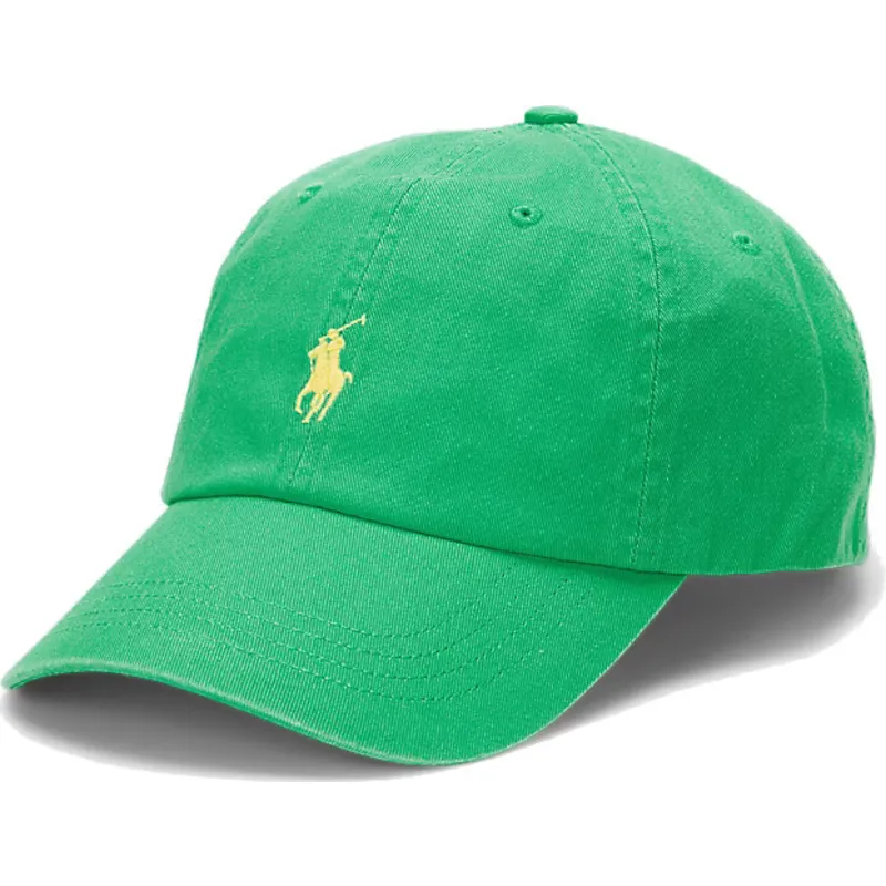 Polo Ralph Lauren Cotton Chino Classic Sport justerbar grön böjd keps med gul logotyp är ett måste-ha tillbehör för alla vuxna som letar efter en sportig och sofistikerad stil. Denna unisex-designkeps har en justerbar remstängning som gör att den kan anpassas perfekt till alla huvudstorlekar. Den gula Polo Ralph Lauren-logotypen sticker ut på framsidan av kepsen och lägger till en pop av livfulla färger till dess klassiska gröna design.