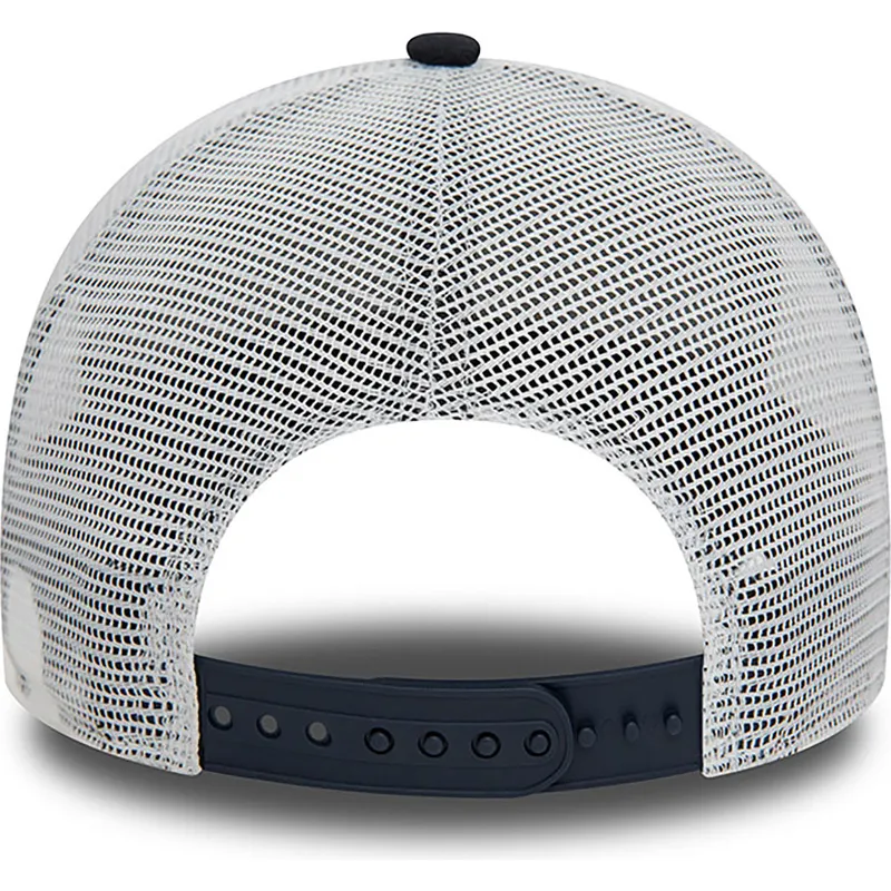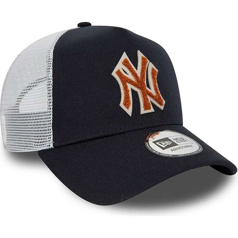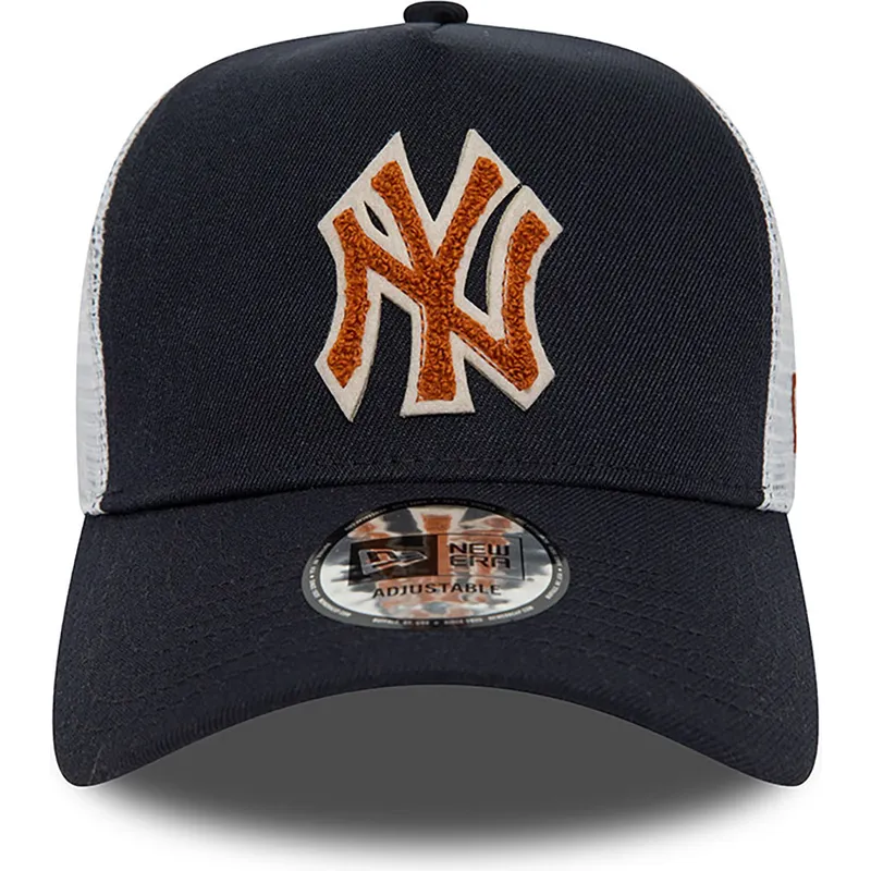 Den marinblå och vita truckerkepsen med brun logotyp A Frame Boucle of New York Yankees MLB från New Era är perfekt att bära i dina dagliga aktiviteter, oavsett om du går till gymmet, springer eller bara för att ge en sportig touch till din look tillfällig. Med snapback-stängningen kan du justera kepsen till den storlek du vill ha, vilket säkerställer en bekväm och säker passform hela tiden. Dessutom, eftersom det är en unisex-design, kan både män och kvinnor bära den med stil och personlighet.