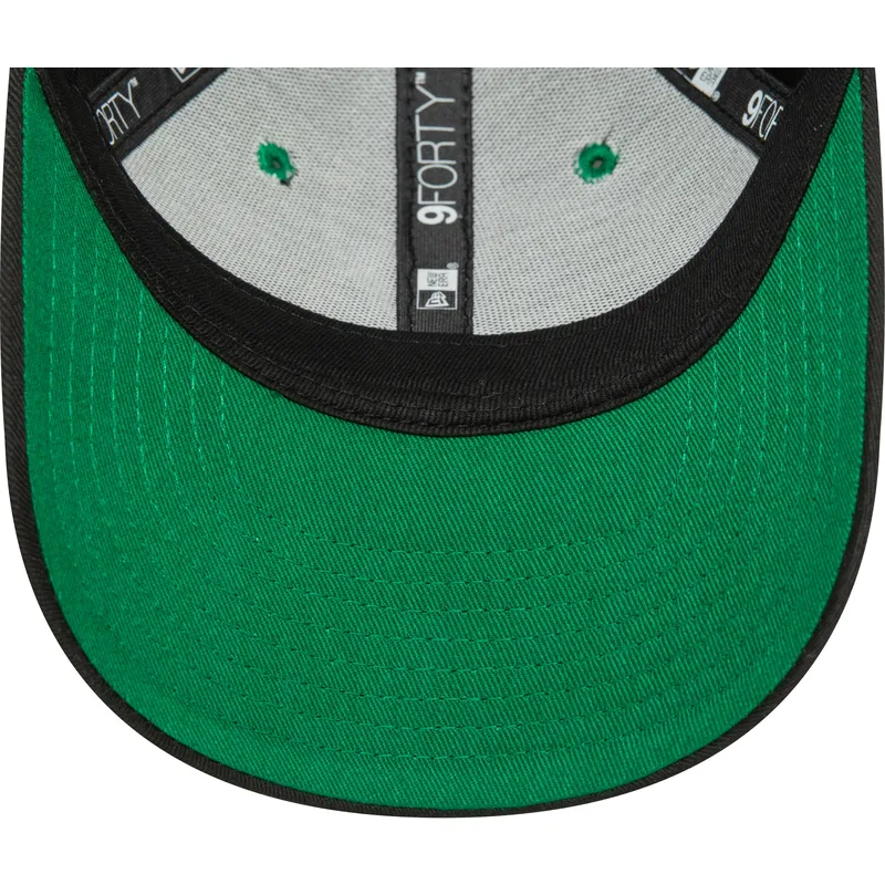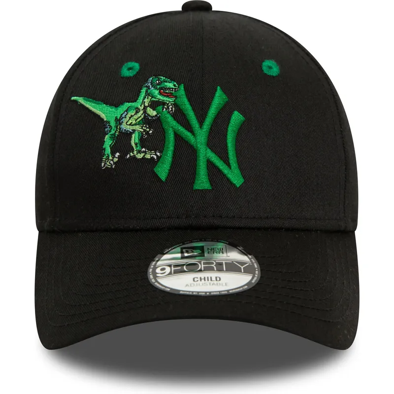 New Era New York Yankees MLB 9FORTY Grafisk dinosaurie justerbar svart böjd mössa med grön logotyp för barn är perfekt att följa med de små på deras dagliga äventyr. Oavsett om det är i parken, i skolan eller på en speldag, kommer den här kepsen att ge dem skydd och stil. Dessutom, eftersom det är unisex, kan det delas mellan syskon, kusiner eller vänner.