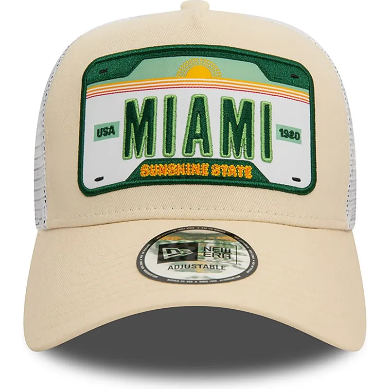 Den beige och vita A Frame License Plate Miami Cities and Beaches truckerkeps från New Era är den perfekta accessoaren för alla vuxna som vill visa upp en urban stil och en strandstil på samma gång. Med sin snapback-stängning passar den här kepsen perfekt till alla huvudstorlekar, vilket ger komfort och stil till alla som bär den.
