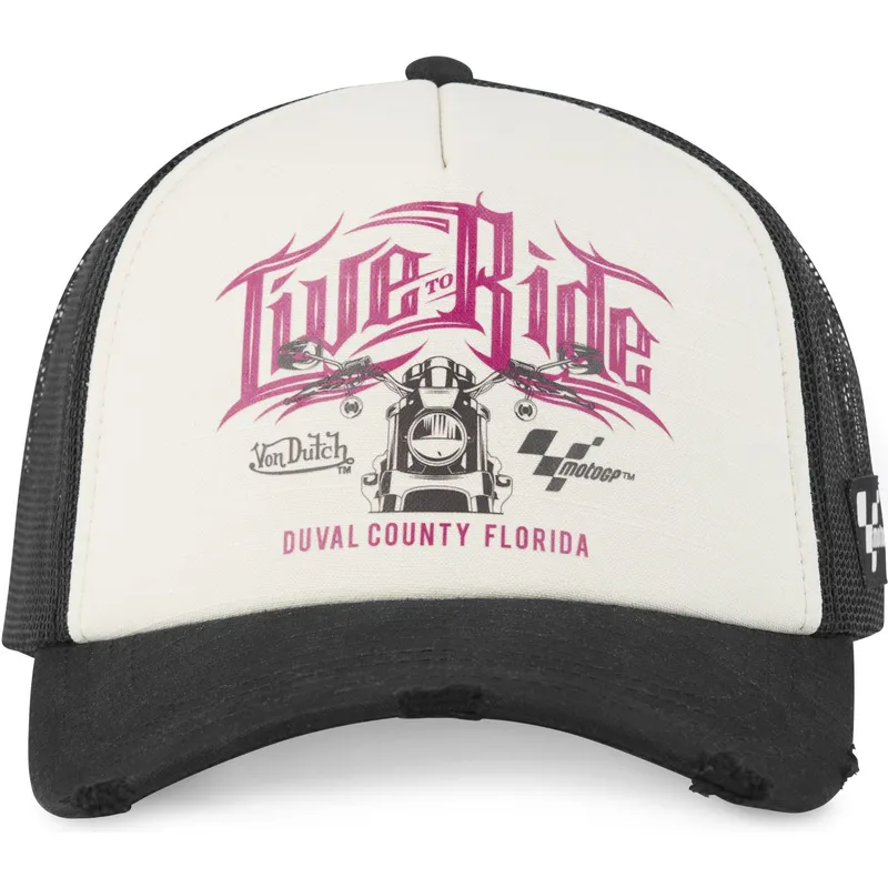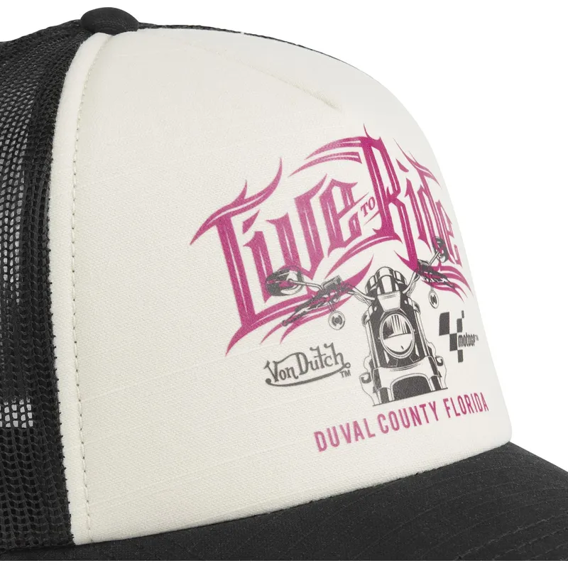 MOTO2 beige och svart truckerkeps från Von Dutch är det perfekta tillbehöret för att komplettera din avslappnade, urbana look. Med sin unisexdesign är denna keps idealisk för vuxna som letar efter en unik och djärv stil. Snäppback-stängningen säkerställer en perfekt passform för alla huvudstorlekar, medan dess lastbilsform ger en retro och modern touch på samma gång.