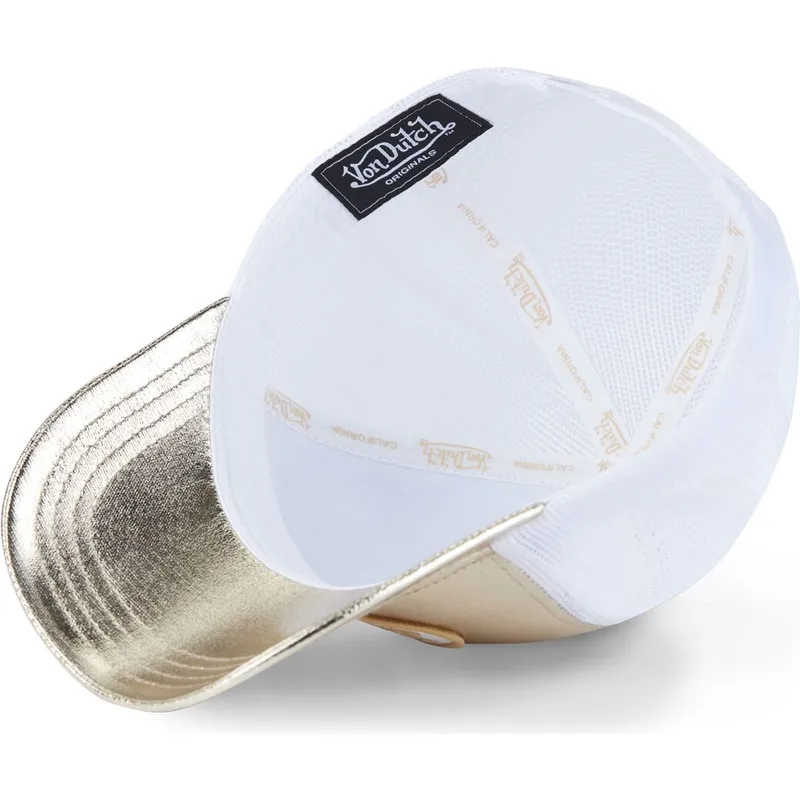 Von Dutch-märket har behållit sin prestige på marknaden tack vare produkter som denna REG G guldfärgade truckerkeps, som återspeglar kvalitet och äkthet. Kepsens styva struktur framtill säkerställer att den behåller sin ursprungliga form, medan nätryggen säkerställer konstant ventilation, perfekt för att förhindra värmeuppbyggnad. Denna kombination av material och design gör kepsen inte bara visuellt tilltalande utan också funktionell för vardagligt bruk. Uppmärksamhet på detaljer i varje söm och finish understryker Von Dutchs engagemang för excellens och positionerar denna keps som ett nyckelplagg för dem som värdesätter både estetik och praktiskhet.