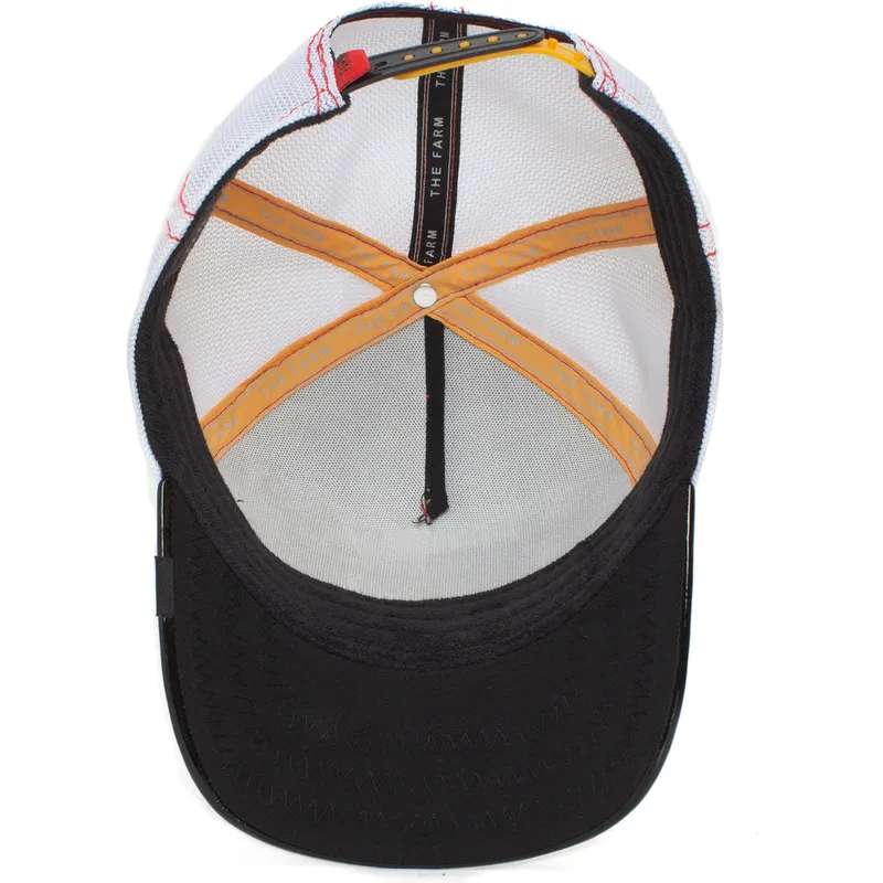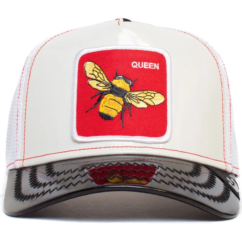 Goorin Bros. The Red Queen Patent Leather The Farm Bee White and Black Trucker Cap är ett konstverk i sig. Den broderade bi-lappen är kepsens mittpunkt. Biet är ett djur som representerar styrka och lagarbete. Dessutom är lappen tillverkad med en broderiteknik som ger den en snygg och hållbar finish.